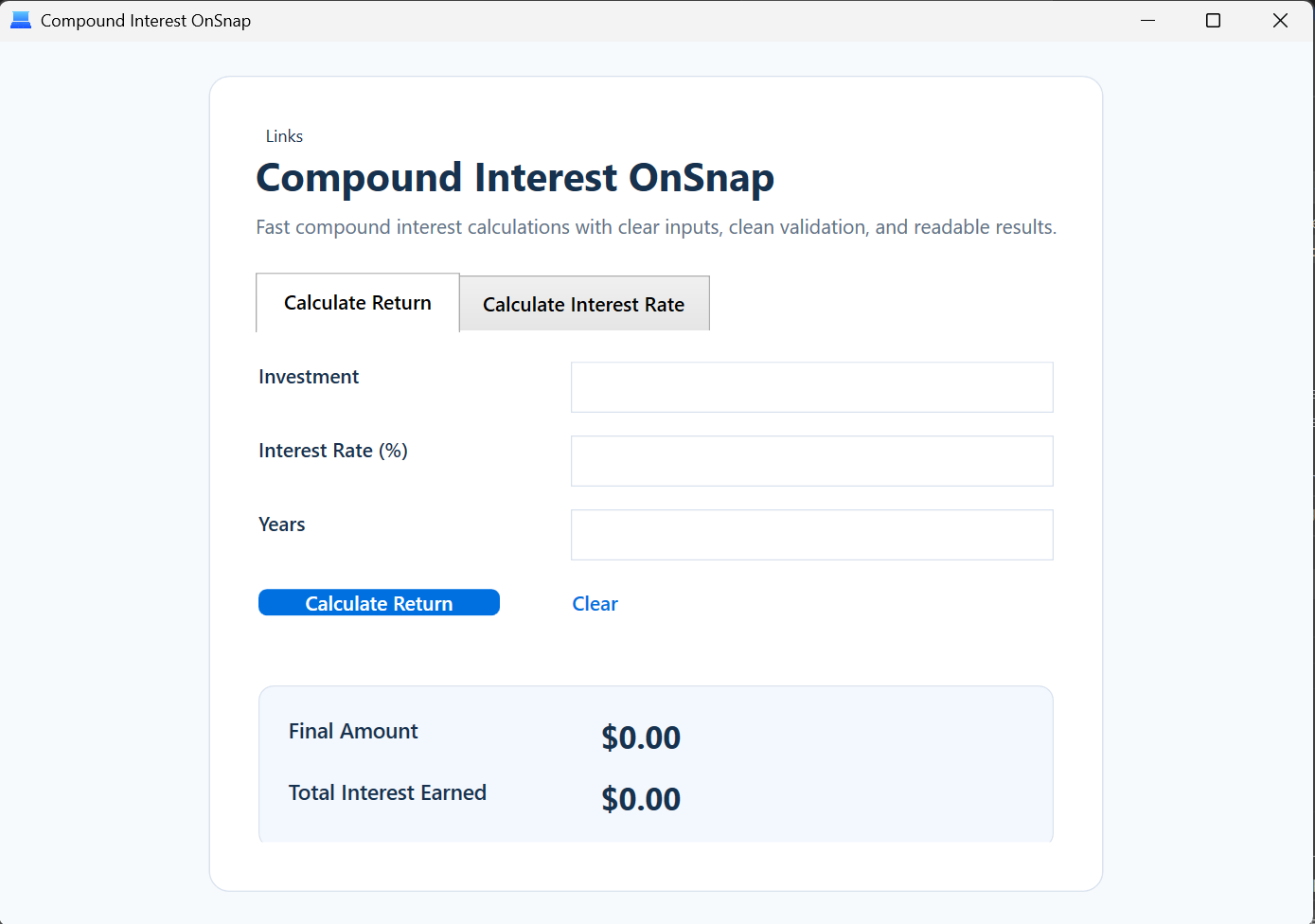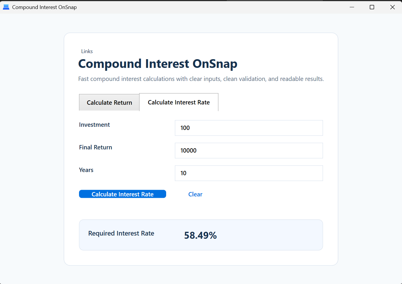 Compound Interest OnSnap is not trying to be a full financial planning suite. It is a practical calculator that solves a narrow problem clearly and quickly.