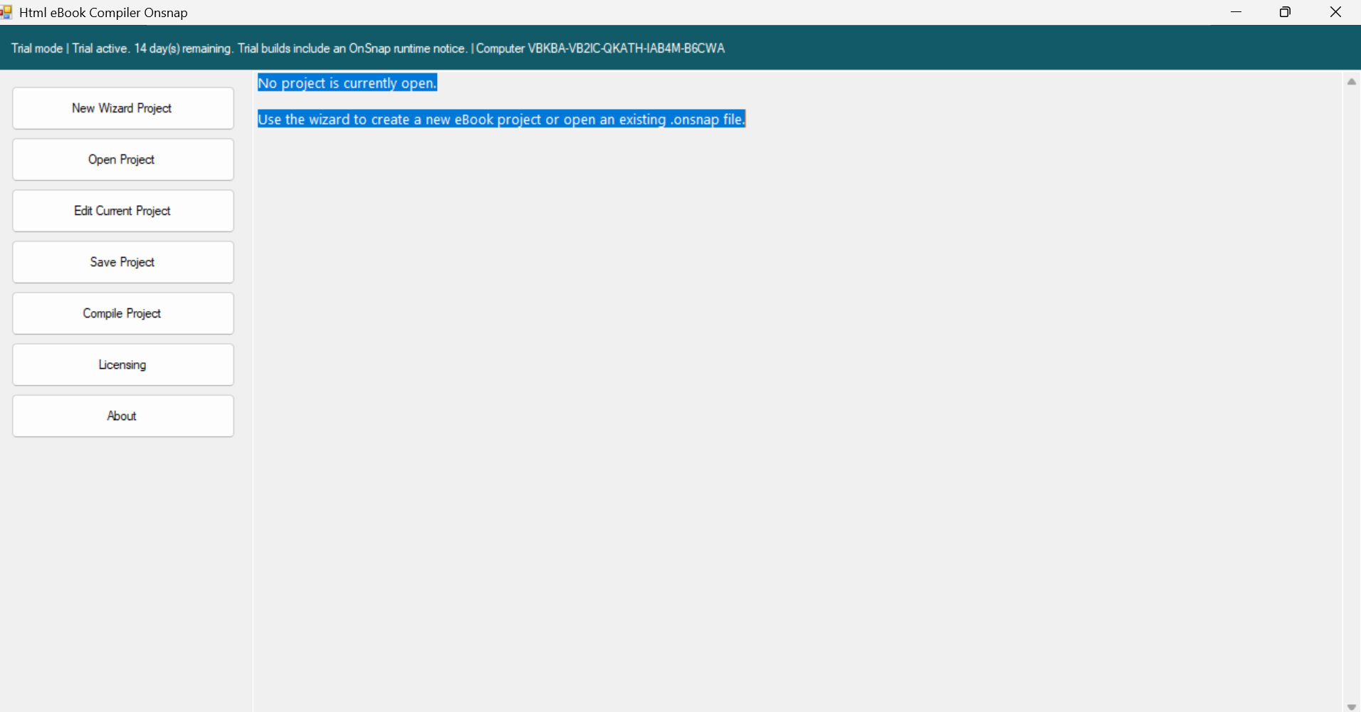The trial is intended to let you test project setup, compilation, and the overall eBook workflow. Trial-generated output may include OnSnap trial branding.